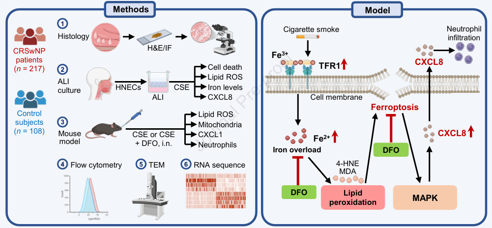 Pan L, Yu Z, Xiang W X, et al. Cigarette smoke–induced epithelial cell ferroptosis promotes neutrophilic inflammation in patients with nasal polyps[J]. Journal of Allergy and Clinical Immunology, 2025.