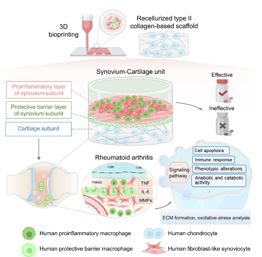 类风湿关节炎(RA)模型在治疗发现和基础研究中发挥着关键作用。然而,现有模型在准确模拟体内微环境方面存在局限性,并且缺乏复杂的细胞间相互作用。在此,本研究提出了一种体外RA模型,该模型能够真实复刻体内软骨和滑膜衬里的功能和组成特性,通过将软骨细胞再细胞化到II型胶原蛋白支架上,并利用3D生物打印技术构建包含成纤维样滑膜细胞(FLS)和促炎性巨噬细胞的顶层以及保护屏障巨噬细胞的底层的双层明胶-基质胶水凝胶来建立。